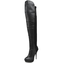 - Leather and stretch textile upper in an over-the-knee dress platform boot style with round toe